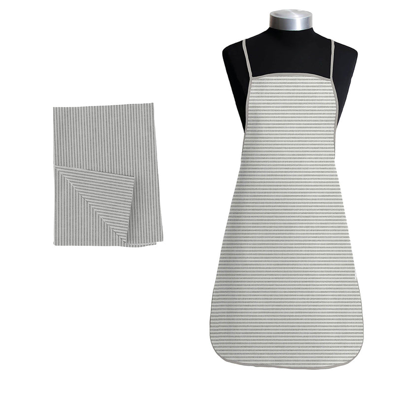 Grembiule filo green in misto cotone e set di 2 canovacci in misto cotone. Composizione tessuto: 84% Cotone Riciclato 16 % Poliestere. Made in Italy