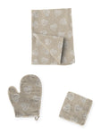 Il set cucina shabby è composto da 1 presina, 1 guanto forno e 1 canovaccio. Composizione tessuto: 50% Cotone, 50% Poliestere. Made in Italy