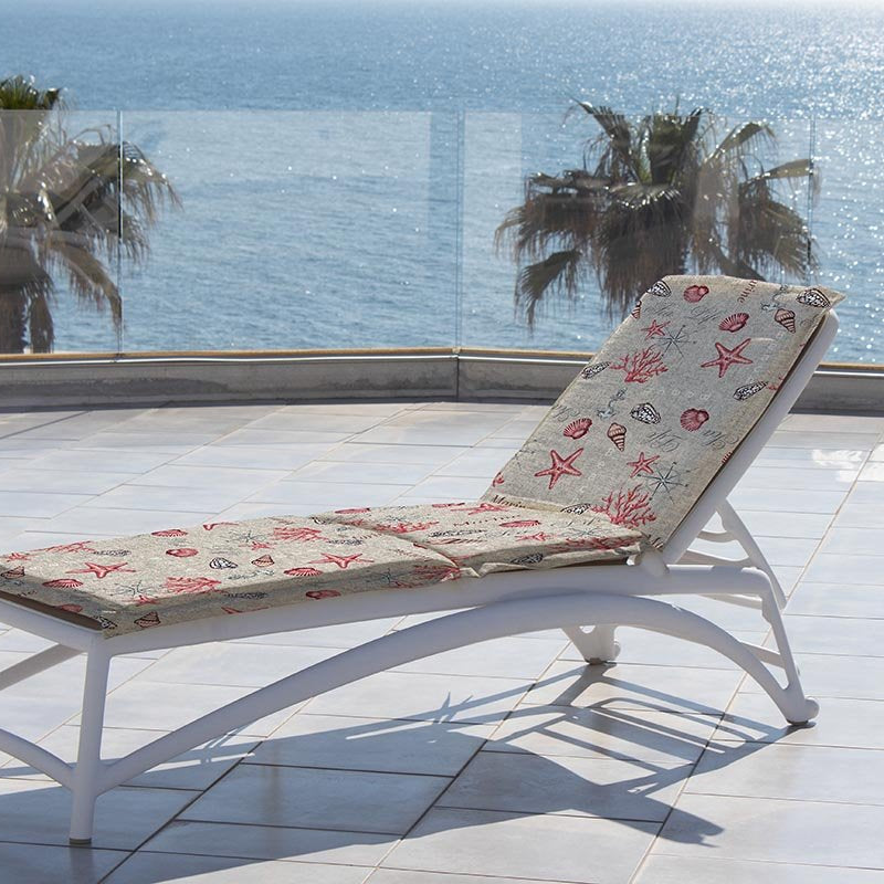 Cuscino per lettino antimacchia e sfoderabile. Misura: 59x193 cm. Spessore: 4 cm. Composizione tessuto: 50% Cotone, 50% Poliestere. Imbottitura: spugna 100% poliestere. La collezione giamaica è pensata per il giardino, la veranda e la spiaggia. Il tessuto è realizzato in misto cotone con trattamento antimacchia. Made in Italy