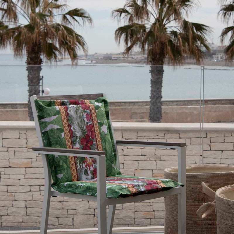 Cuscino con schienale basso per sedia antimacchia e sfoderabile. Misura: 44x88 cm. Spessore: 4 cm. Composizione tessuto: 50% Cotone, 50% Poliestere. Imbottitura: spugna 100% poliestere. La collezione giamaica è pensata per il giardino, la veranda e la spiaggia. Il tessuto è realizzato in misto cotone con trattamento antimacchia. Made in Italy