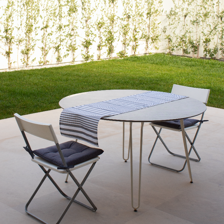 Set di 1 Runner in tessuto morbido, perfetto per qualsiasi tavolo da interno e da giardino e 2 cuscini per seduta trapuntati in tinta unita.