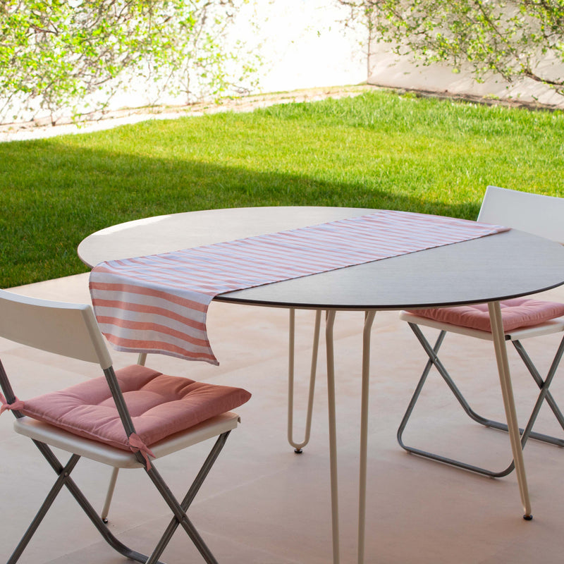 Set di 1 Runner in tessuto morbido, perfetto per qualsiasi tavolo da interno e da giardino e 2 cuscini per seduta trapuntati in tinta unita.