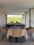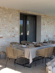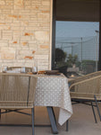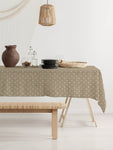 Tovaglia Filo Green in tessuto jacquard tinto in filo. Perfetta per tavoli da interno e da giardino che ospitano 6, 8 e 12 persone. Disponibile in 2 misure. Composizione tessuto: 84% Cotone Riciclato 16 % Poliestere. Made in Italy
