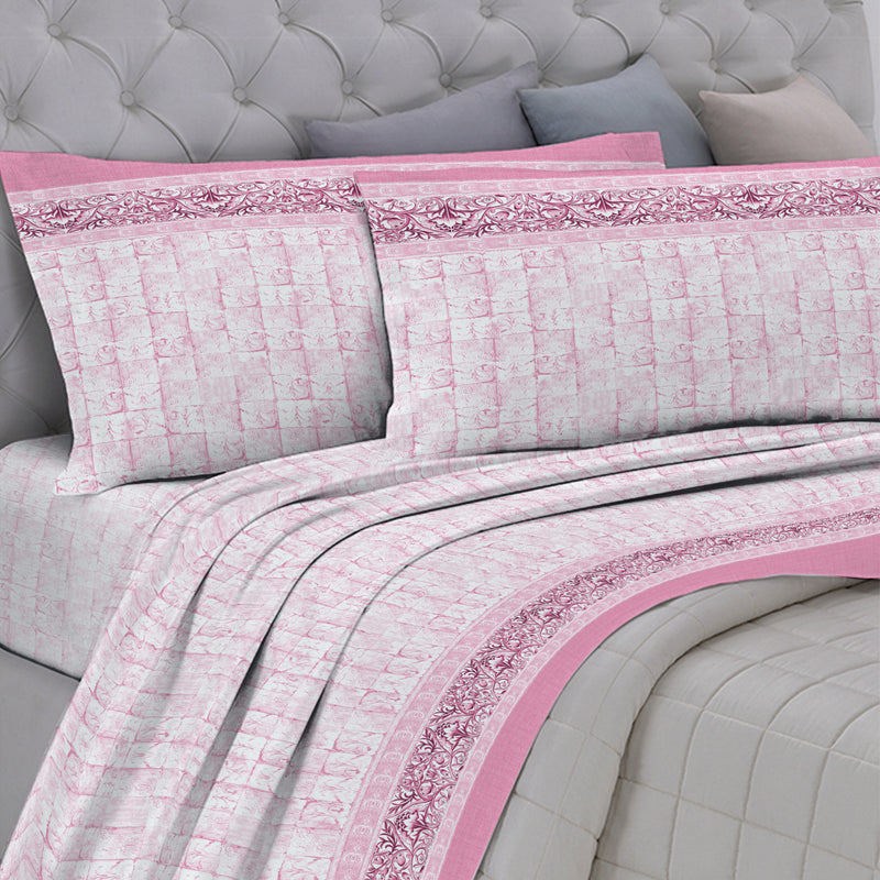Completo letto in puro cotone fantasia LAVANDA. Singolo: sopra 150x295 cm, sotto 90x198 cm con angoli elasticizzati. Piazza e mezza: sopra 180x300, sotto 180x198 con angoli elasticizzati Matrimoniale: sopra 250x295 cm, sotto 115x198cm con angoli elasticizzati. Federe: 50x80 cm. Disponibile in più colori. Made in Italy