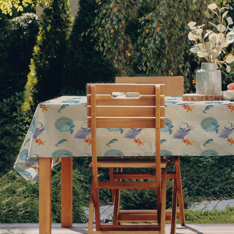 Tovaglia giamaica antimacchia disponibile in 3 misure. Composizione tessuto: 50% Cotone, 50% Poliestere. La collezione giamaica è pensata per il giardino, la veranda e la spiaggia. Il tessuto è realizzato in misto cotone con trattamento antimacchia. Made in Italy